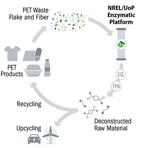 Cercetător principal la National Renewable Energy Laboratory (NREL) din Statele Unite Realitatea este că majoritatea produselor PET, în special îmbrăcămintea și covoarele PET, nu sunt reciclate folosind tehnici tradiționale de reciclare astăzi. Comunitatea de cercetare dezvoltă alternative promițătoare, inclusiv enzime care vizează depolimerizarea PET-ului, dar chiar și aceste alegeri se bazează adesea pe consumul ridicat de energie și pe pașii de pretratare cu costuri ridicate pentru a fi eficiente.