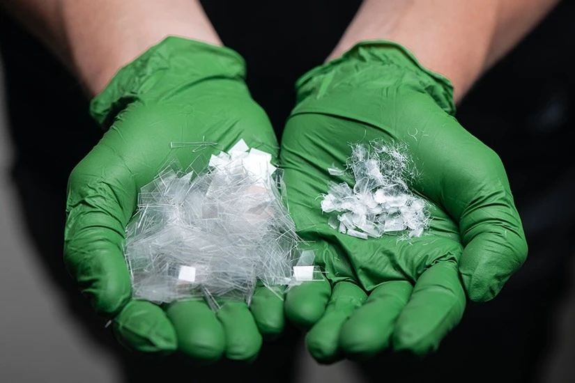 Platforma de recuperare a enzimelor a companiei NREL/UoP descompune efectiv materia primă din plastic PET (stânga) în unitățile sale structurale chimice. Proba de PET din dreapta a scăzut în masă cu 97,7% după ce a fost hidrolizată de enzimele companiei NREL/UoP.