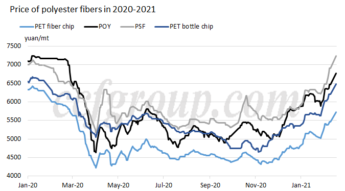 Companiile de fibre de poliester se bucură de putere discursivă la cotațiile pe piață atunci când sarcina stocurilor nu este mare, costul materiilor prime este susținător, recuperarea în aval este lină și se așteaptă ca capacitatea din aval să crească în prima jumătate a anului 2021. De fapt, prețul produselor din poliester tinde să crească în termen scurt, deoarece companiile de poliester sunt dornice să crească prețurile. Susținut de cost, prețurile fibrelor de poliester se anticipează să revină la nivelul de dinaintea pandemiei. Prețul PSF a atins acum nivelul pre-pandemie.