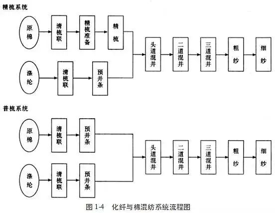 Atunci când poliesterul (sau alte fibre chimice) și bumbacul sunt amestecate, datorită proprietăților și impurităților diferite ale fibrelor de poliester și bumbac, acesta nu poate fi amestecat și procesat în procesul scrisorii de dragoste și este necesar să se facă benzi de zăbrele și apoi se amestecă la prima mașină de desenat drum (amestecare), pentru a asigura amestecarea, sunt necesare trei benzi paralele. Fluxul procesului de pieptănare generală și filare pieptănată este prezentat în figura de mai jos.