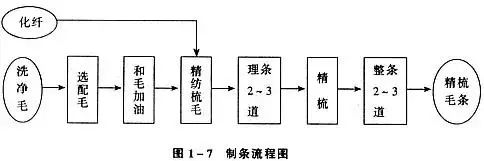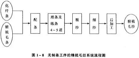 Unele fabrici de lână pieptănată nu au un proces de fabricare a benzilor, folosind benzi de lână pieptănată ca materie primă, iar procesul de producție include prefilare și postfilare; Majoritatea fabricilor nu au un proces de vopsire și pieptănare a benzilor, care se referă la a doua pieptănare după vopsirea lânii, iar procesul de recombinare este similar cu procesul de fabricare a benzilor. Fluxul sistemului de filare a lânii pieptănate fără un proces dublu de pieptănare este prezentat în Figura 1-8. În plus, există un sistem de proces de filare semipieptănat între pieptănat și pieptănat.