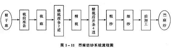 În general, se împrumută sisteme de filare a lânii pieptănate sau mătase și se fac doar îmbunătățiri locale asupra echipamentelor. Cânepa crudă trebuie mai întâi pretratată și procesată în cânepă fină, iar procesul de filare este prezentat în figura de mai jos; Ramia scurtă și zada pot fi prelucrate în general printr-un sistem de filare a bumbacului.